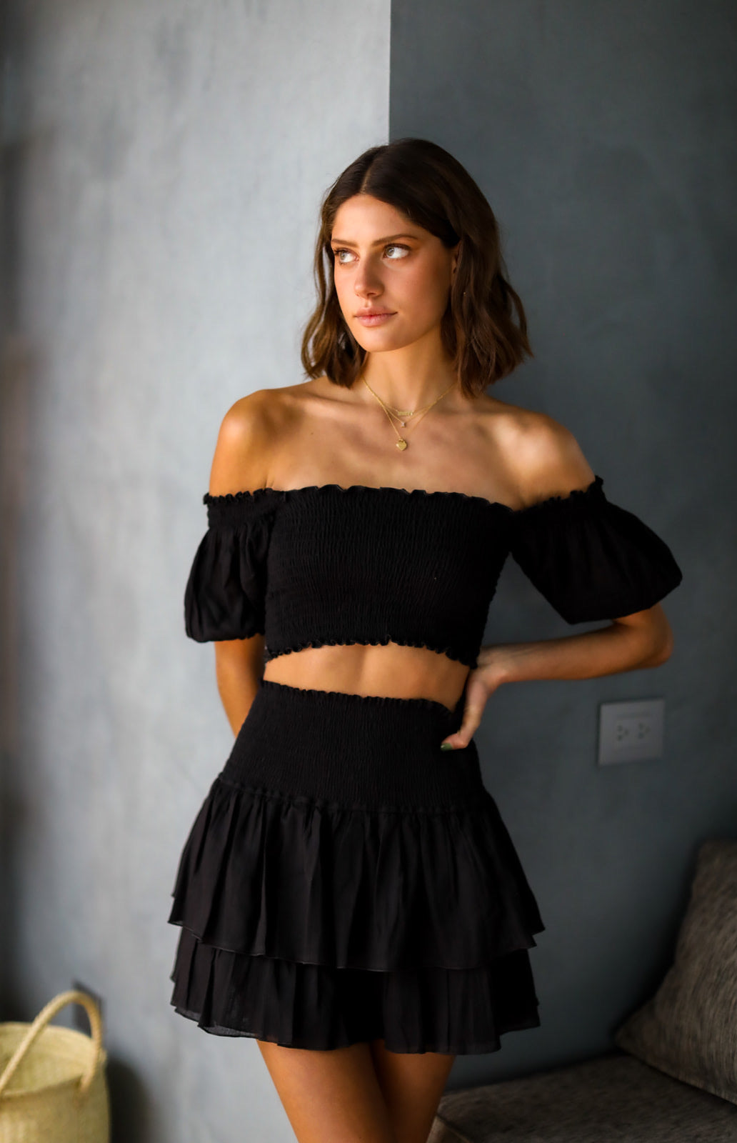 The Camila Mini Skirt is made with 100% organic cotton.It features smoking at the waist line for ultimate comfort and tiered ruffle trimming throughout.