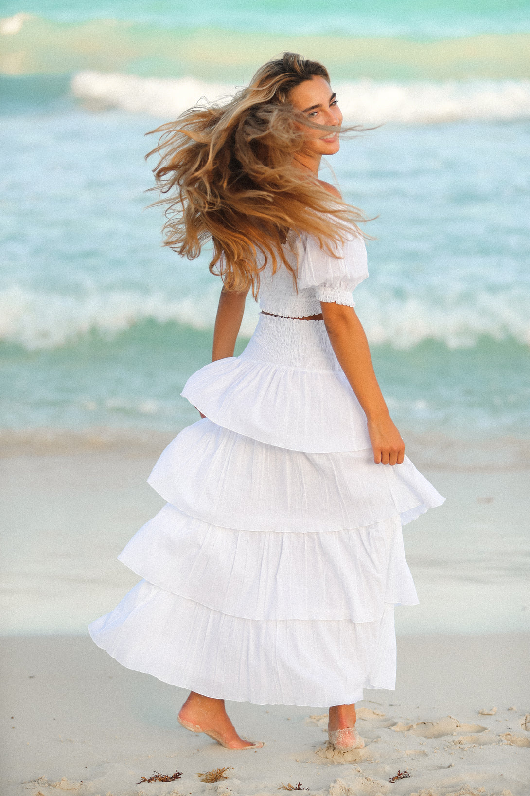It features smoking at the waist line for ultimate comfort, an A-line silhouette and tiered ruffle trimming throughout.