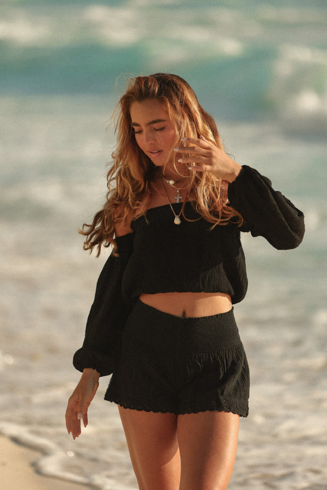 Our Malay black short is a go-to for hot seasons in organic Mexican cotton. The mini short has an elasticated waistband and lace insets to add a touch of femininity.