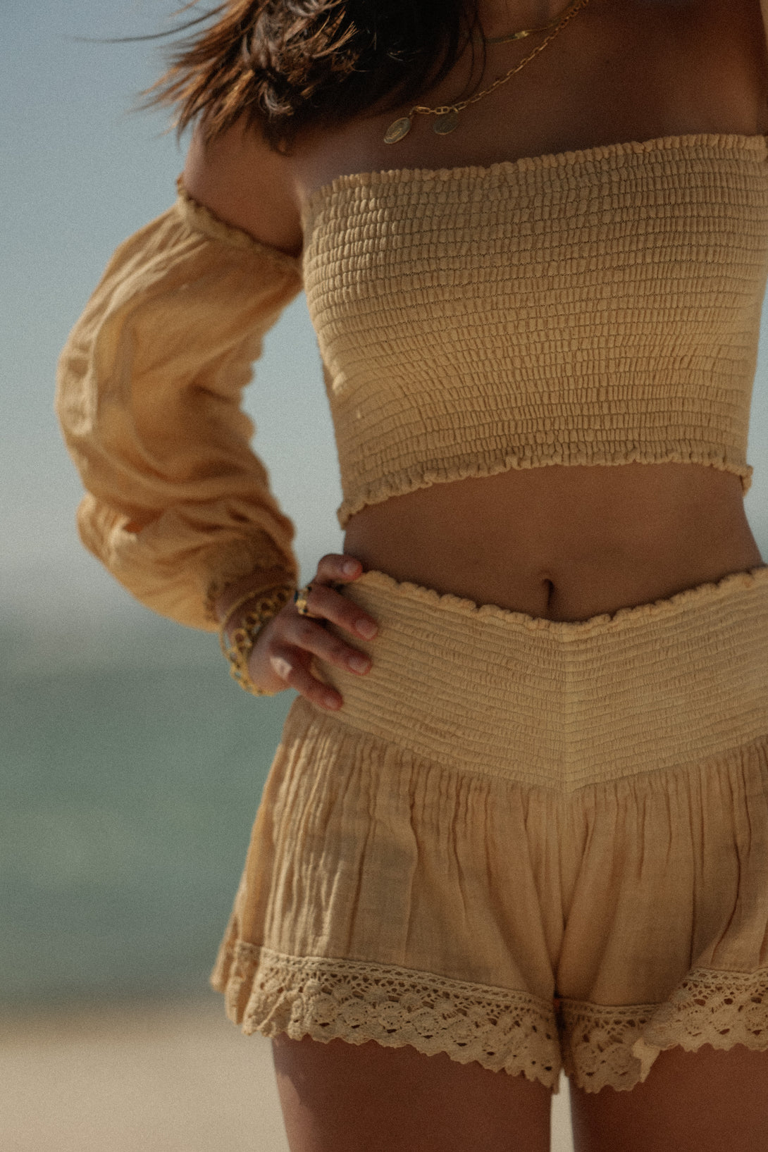 Our Malay black short is a go-to for hot seasons in fresh organic Mexican cotton. The mini short has an elasticated waistband and lace insets to add a touch of femininity, perfect for you next vacation.