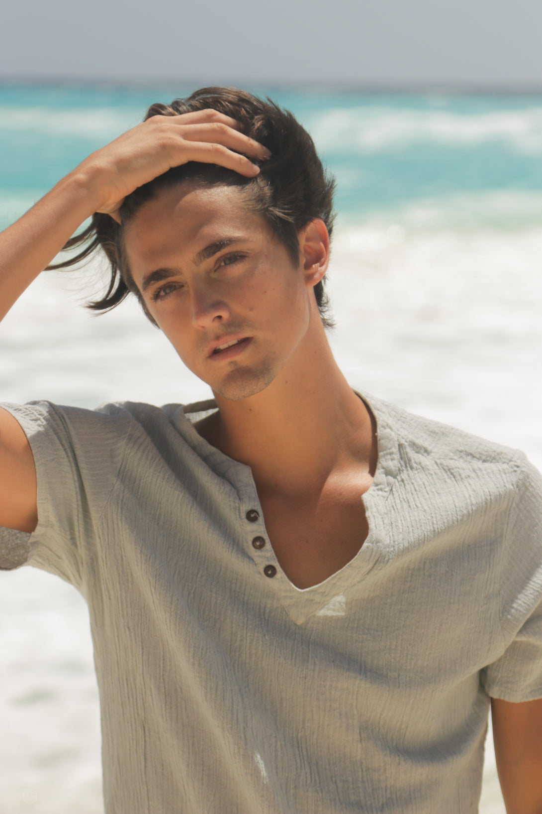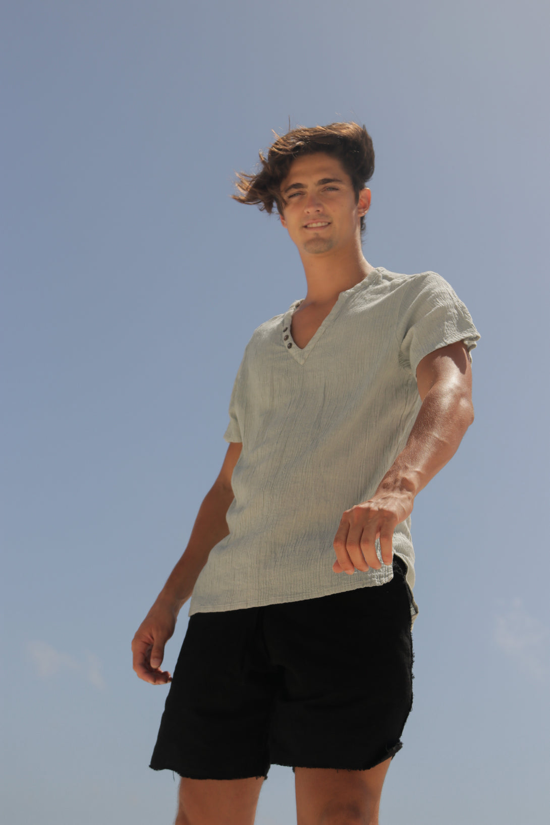 The Tom T-shirt is 100% organic cotton with short sleeves, v neck and coconut buttons.