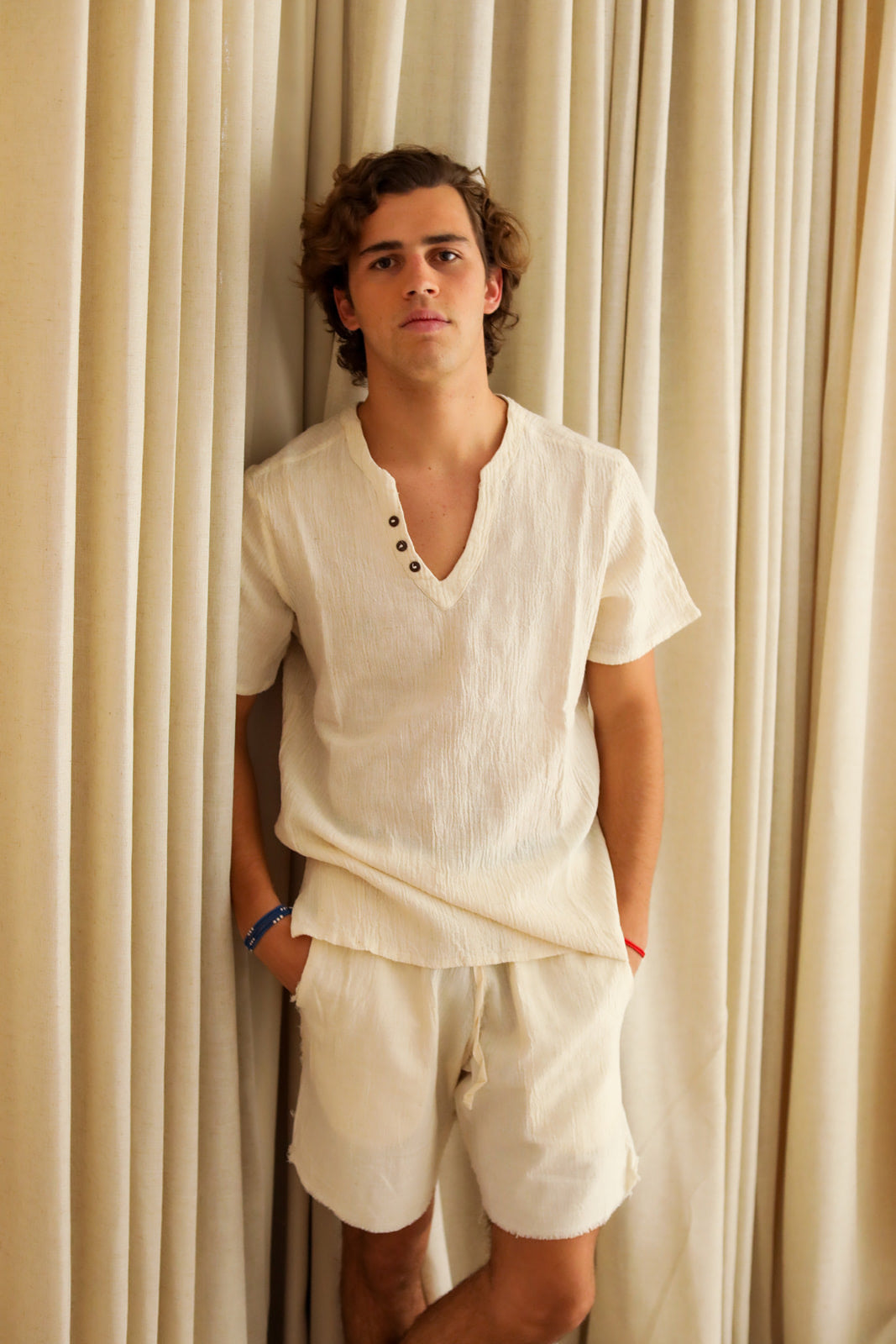 The Tom T-shirt is 100% organic cotton with short sleeves, v neck and coconut buttons.